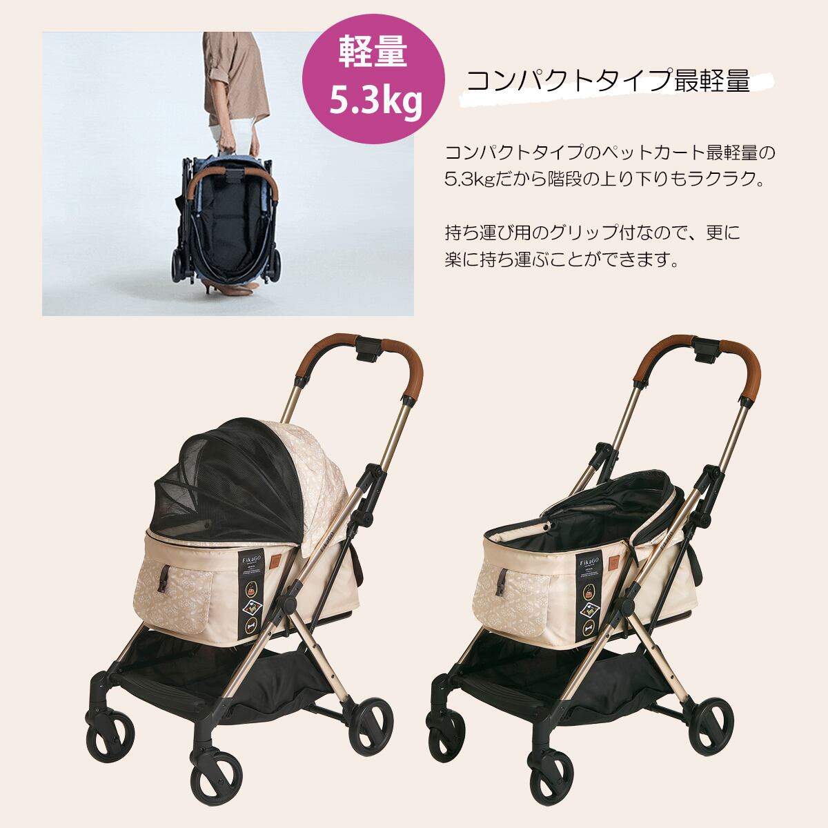 コンパクトタイプのペットカート最軽量の5.3kgだから階段の上り下りもラクラク。
