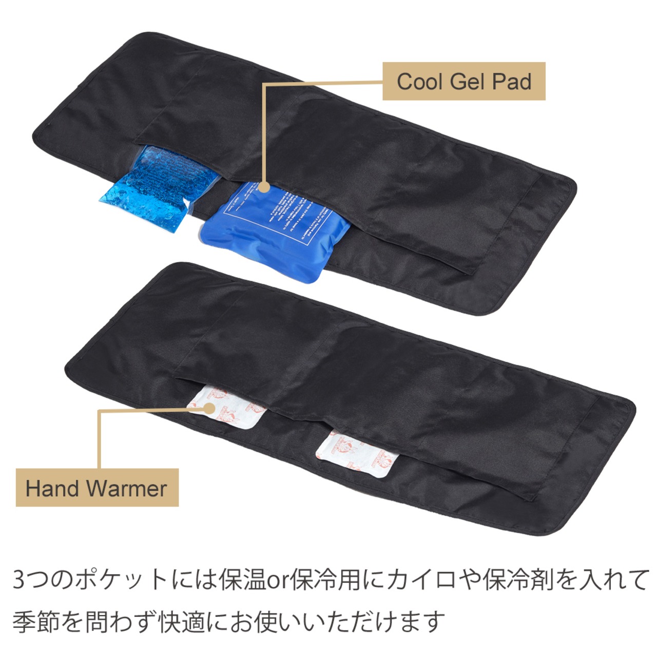 3つのポケットには保温or保冷用にカイロや保冷剤を入れて季節を問わず快適にお使いいただけます