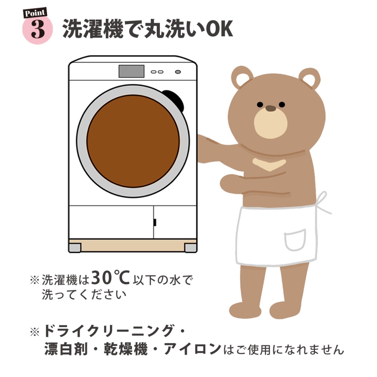 ※洗濯機は30℃以下の水で洗ってください