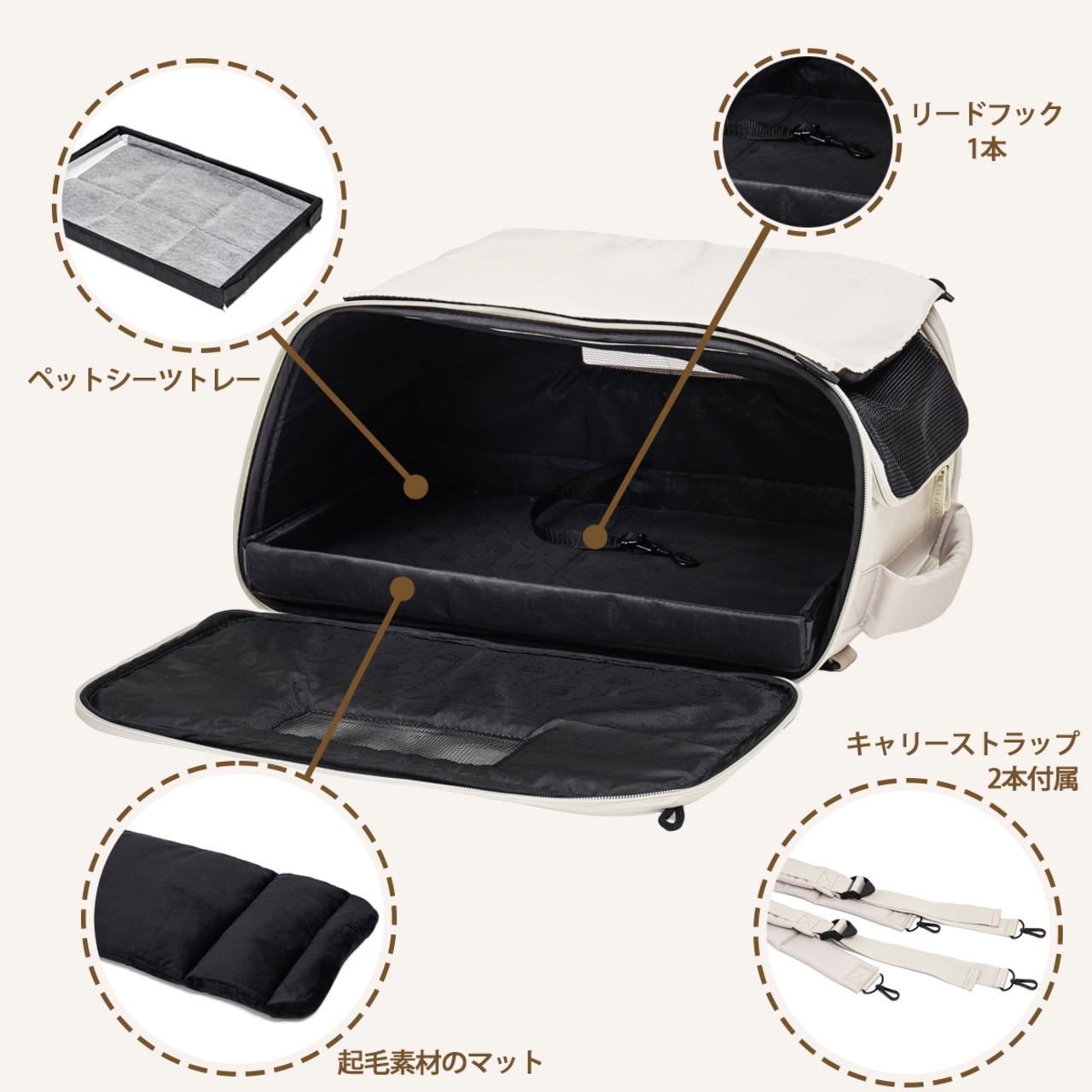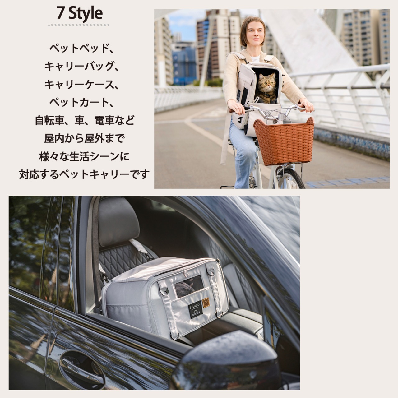 ペットベッドの他、キャリーバッグ、キャリーケース、ペットカート、自転車、車、電車など屋内~屋外まで様々な生活シーンに対応するペットキャリーです