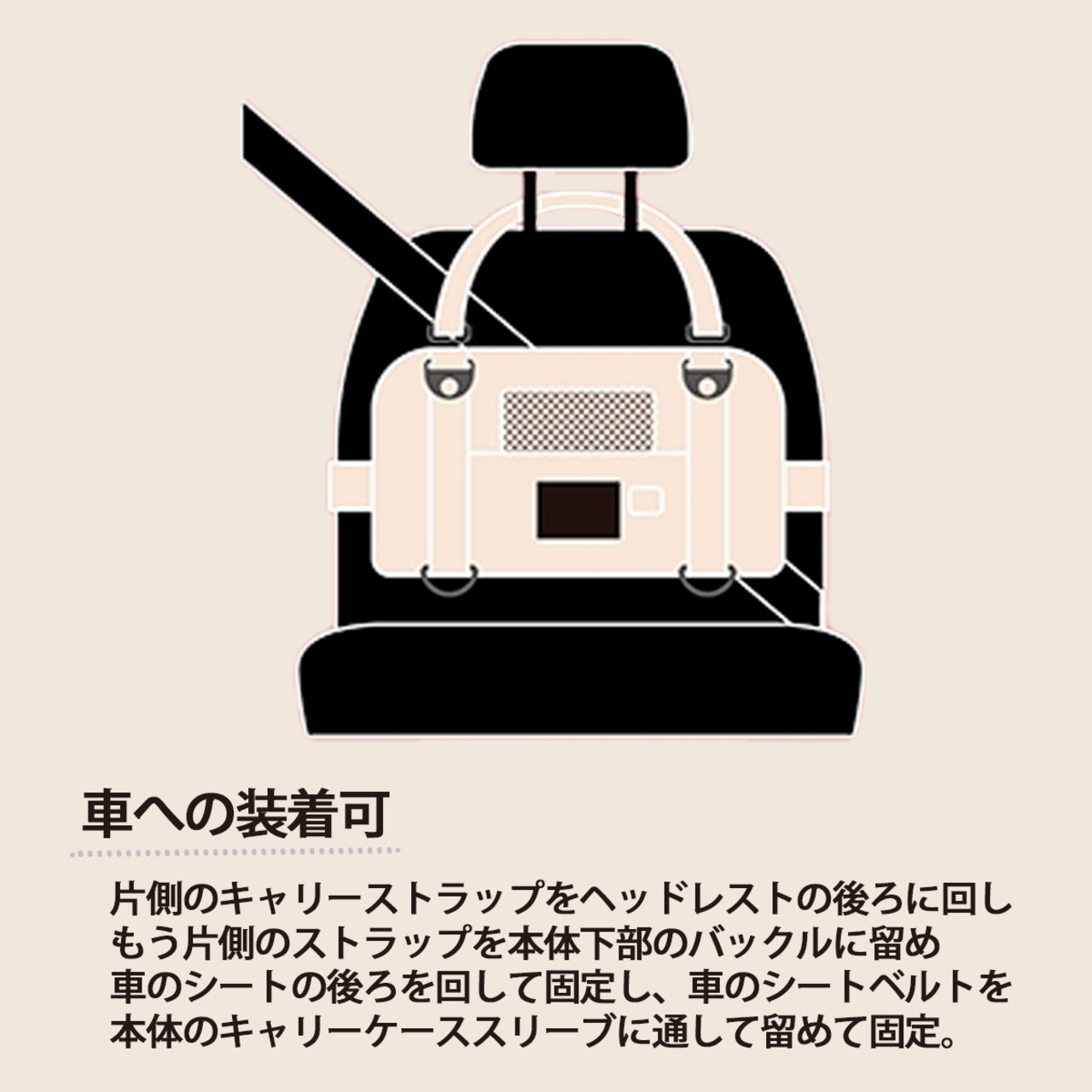 片側のキャリーストラップをヘッドレストの後ろに回し、もう片側のストラップを本体下部のバックルに留め、車のシートの後ろを回して固定し、車のシートベルトを本体のキャリーケーススリーブに通して留めて固定