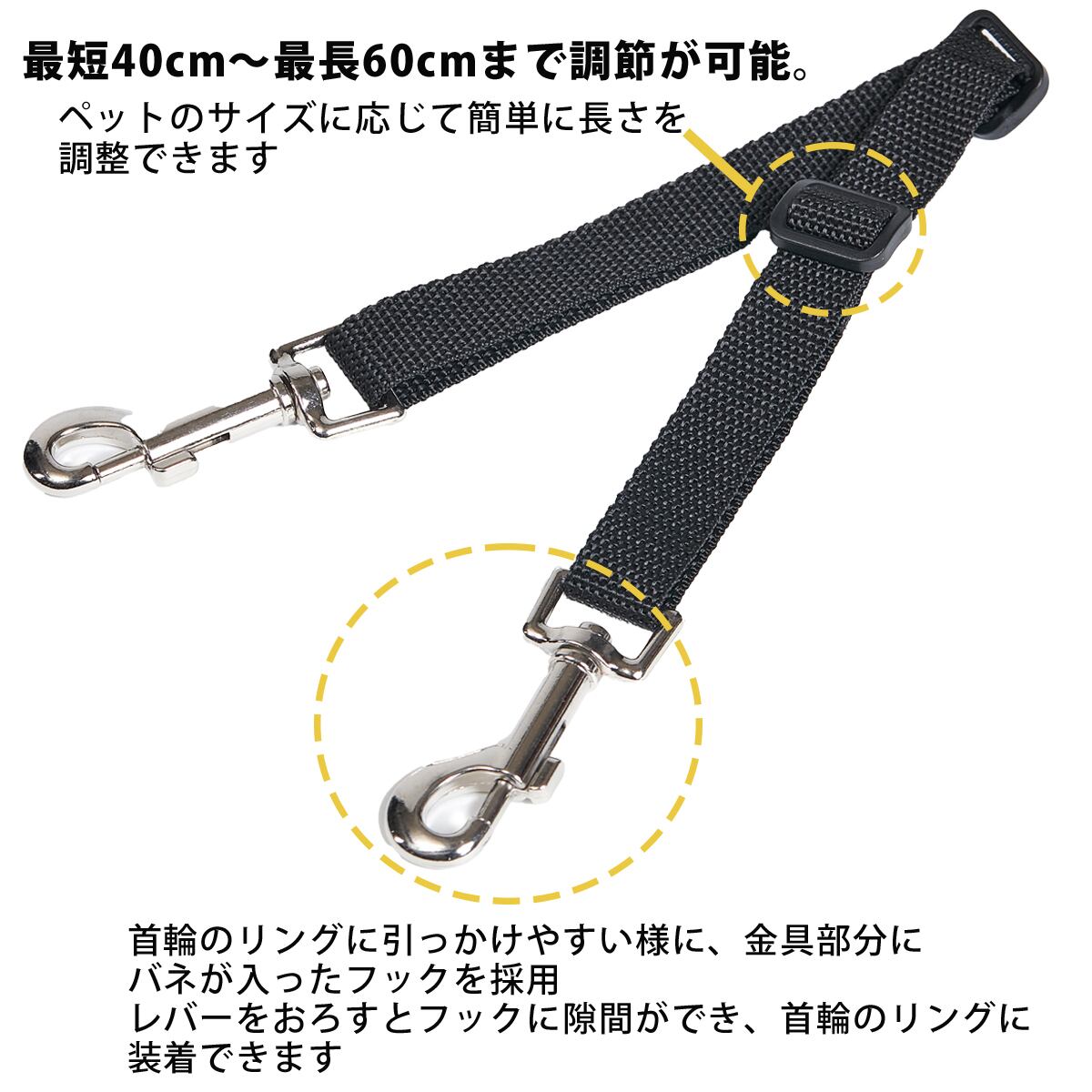 プラスチックのパーツをスライドするだけで最短40cm~最長60cmで調節ができ、ペットのサイズに応じて簡単に長さできます。