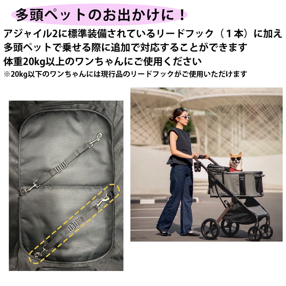 アジャイル2に標準装備されているリードフック(1本)に加え、多頭ペットで乗せる際に追加で対応することができます。